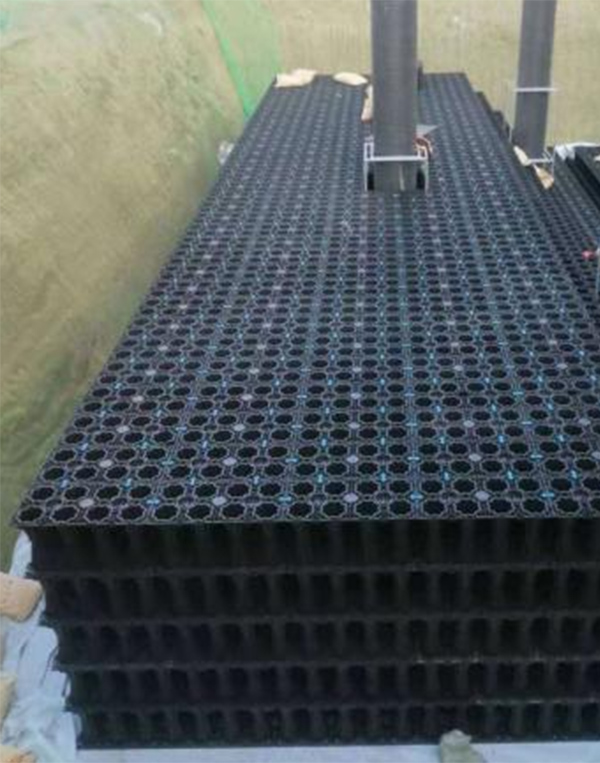 (3)底板清理完畢,確保無(wú)垃圾等之后,鋪好土工布、防水膜,把模塊進(jìn)行堆放。模塊堆放的過(guò)程中要確保卡口件正常使用好。同層模塊之間卡在一起層模塊落在下層凸起的卡口上。